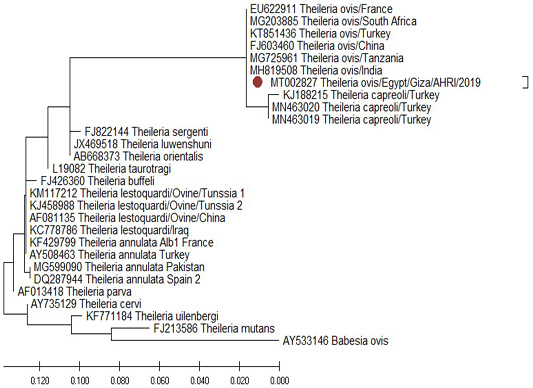 Phylogenetic tree of T. ovis (MT002827) revealed 98% homology with T. ovis from (MG203885), (EU622911), (KT851436), (FJ603460), (MG725961) and (MH819508).