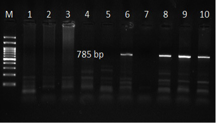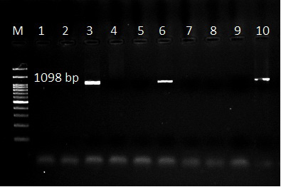 Ethidium bromide stained gel electrophoresis showing specific bands from PCR amplified products by using T. lestoquardi specific primer in lane 6, 8, 9 and 10. Lane M: marker 100 bp.