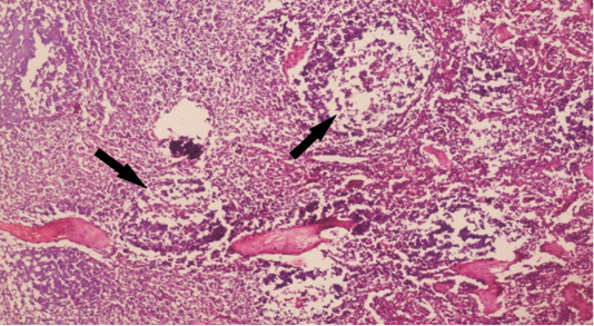 Microphotograph of sheep lymph node showing depletion and necrosis of multiple lymphoid follicles (arrows) (H and E, x200).
