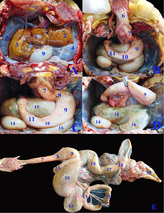 A, B, C, D; The coelomic cavity of Healthy female Desert Egyptian tortoise after removing the plastron (fresh specimen). E: Photograph showing separated healthy GIT. 1. Heart 2. Left lobe of liver 3. Right lobe of liver 4. Left lung 5. Right lung 6. Trachea 7. Esophagus 8. Gastro esophageal sphincter 9. Stomach 10. Pyloric sphincter 11. Duodenum 12. Jejunal loops. 13. Ileum 14. Cecum 15. Ascending colon 16. Transverse colon 17. Descending colon 18. Cloaca.