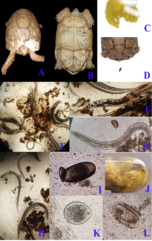 A & B; Clinical presentation of gastroenteritis in Egyptian tortoise, photographs showing multiple areas of white discoloration, pores and cracks in carapace and plastron respectively which indicates severe minerals deficiency due to diarrhea. C: photograph showing diarrhea with the presence of numerous motile worms. D: photograph showing the normal configuration of stool. Fecal samples analysis of diarrheic tortoises; E: Severe infestation with large numbers of adult males, females and larvae of Oxyurid species (4X). F: Adult female Oxyurid species contains large number of eggs (10X). G: Adult male Oxyurid species (10X). H: Larvae of Oxyurid species (4X). I: Oxyurid species egg showing central embryo (40X). J: Gross appearance of diarrheic stool with adult pin worms (Oxyurid species). K: Plantadium species trophozoite (40X). L: Nyctotheris species trophozoite (40X).