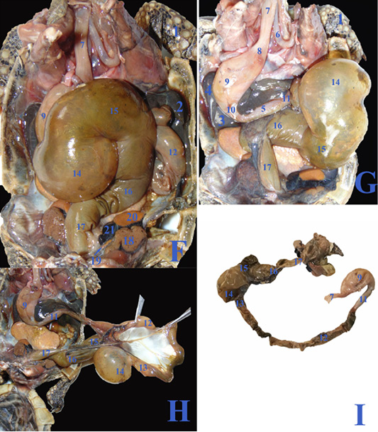 F, G, H; The coelomic cavity of diseased male Desert Egyptian tortoise after removing the carapace (the tortoise was dissected after death freshly). I: Photograph showing separated diseased GIT. 1. Right forelimb 2. Right lobe of liver 3. Left lobe of liver 4. Spleen 5.Pancreas 6. Right bronchus 7. Esophagus 8. Gastro esophageal sphincter 9. Stomach 10. Pyloric sphincter 11. Duodenum 12. Jejunal loops. 13. Ileum 14. Cecum 15. Ascending colon 16. Transverse colon 17. Descending colon 18. Right kidney 19. Right adrenal gland 20. Right testes 21. Right epididymis.