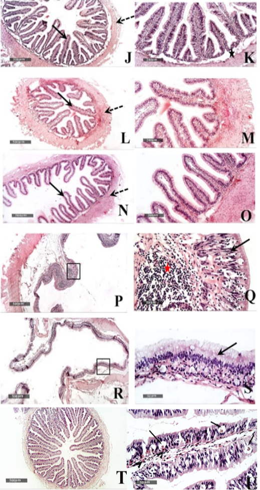 Histological features of Duodenum (J & K), Jejunum (L & M), and Ileum (N &O) - 40 X & 200 X magnifications. Cecum (P & Q) and colon (R & S) H&E stain – 40X & 400 X magnifications. T&U: showing Microscopic examination of intestinal/duodenal samples revealed many intra epithelial parasitic stages all over intestinal villi (arrow) accompanied with underlying lamina propria or intra epithelial eosinophilic infiltrates in (arrowhead).