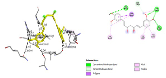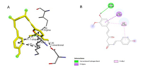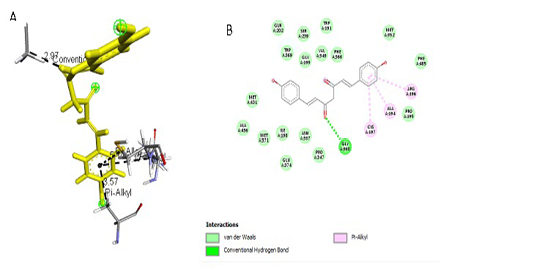 Results of bisdemethoxycurcumin ligand docking to iNOS (A) 3D visualization (B) 2D visualization