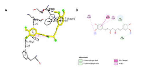 Results of curcumin ligand docking to iNOS (A) 3D visualization (B) 2D visualization
