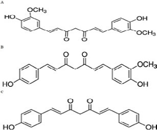 Chemical structure of 3 types of curcuminoids. A: Curcumin; IUPAC name: (E, E) -1, 7-bis (4-Hydroxy-3-methoxyphenyl) -1,6-heptadiene-3,5-dione. B: Demethoxycurcumin; IUPAC name: (1E, 6E) -1- (4-hydroxy-3-methoxyphenyl) -7- (4-hydroxyphenyl) hepta-1, 6- diene-3, 5-dione. C: Bisdemethoxycurcumin; IUPAC name: (E, E) -1, 7-Bis (4-hydroxyphenyl) -1, 6-heptadiene-3, 5-dione (Yang et al., 2015)