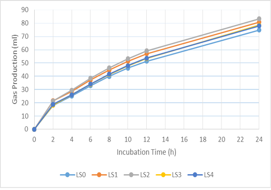 Cumulative gas production of basal ration added with liquid smoke (LS) during 24 hours incubation. LS0 (basal ration+ 0 μl/ml liquid smoke) is added before LS1 (basal ration+ 0.25 μl/ml liquid smoke), LS2 (basal ration+0.5 µl/ml liquid smoke), LS3 (basal ration+0.75 µl/ml liquid smoke), LS4 (basal ration+1 µl/ml liquid smoke).