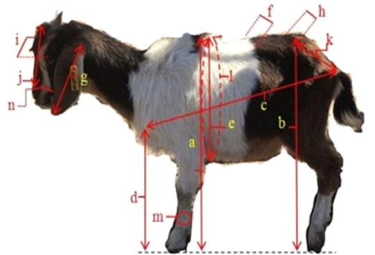 The scheme of body measurements in a South African non-descript doe consisted of withers height (a), rump height (b), body length (c), sternum height (d), body depth (e), bicostal diameter (f), ear length (g), rump width (h), head width (i), head length (j), rump length (k), heart girth (l), cannon circumference (m) and muzzle diameter (n).