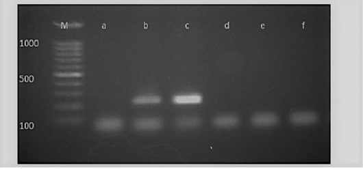 M: marker, Lane a: Negative control, Lane b: Positive control, Lanes c: Positive amplification of nucA gene at 239 bp and Lane d-f: Negative amplification of nucA gene