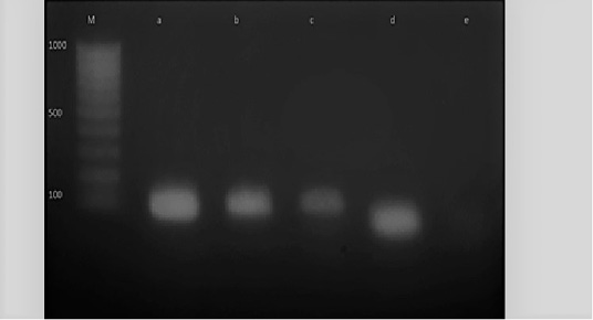 M: marker, Lane e: Negative control, Lane a: Positive control, Lane b and c: Positive amplification of nuc gene at 126 bp and Lane d: Negative amplification of nuc gene