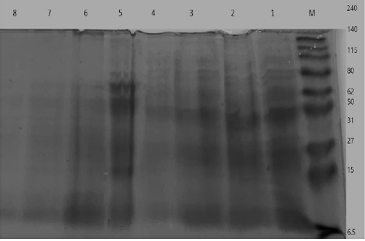 Electrophoretic whole cell protein profiles of different isolated bacteria Lane 1: Molecular size marker (M) with mol. wt. ranges from (6.5 to 240) KD. ; Lanes (1- 4): Staphylococcus bacterial isolates, Lanes (5-8): isolated SCVs.