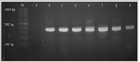 M: marker, Lane a: Negative control, Lane b: Positive control Lanes c-h: Positive amplification of 16Sr DNA gene at 375bp
