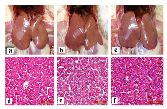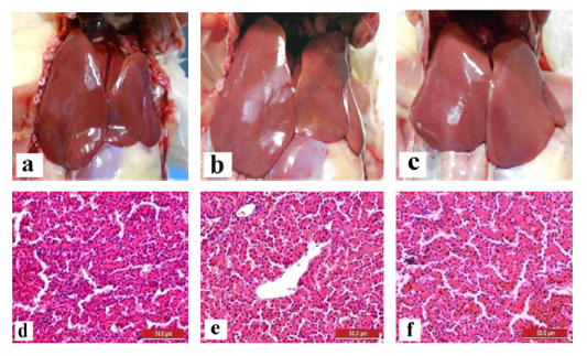 Normal gross and histological findings of liver in all groups of chickens with smooth, glistening surface and normal architecture of hepatocytes lining by sinusoid, respectively, following inoculation with live attenuated UPM1137CEL35 Fowl adenovirus isolate at day 21 post-inoculation (pi). Gross findings indicated from (a) to (c) and histological findings from (d) to (f). (a): Group A inoculated via oral route, (b): Group B inoculated via intraperitoneal (IP) route, (c): Group C: Control, (d): Group A inoculated via oral route, (e): Group B inoculated via IP route, (f): Group C: Control. HE, 40X. Bar = 50µm.