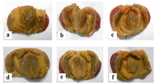 Normal gross finding of gizzard in all groups of chickens with intact koilin layer following inoculation with live attenuated UPM1137CEL35 Fowl adenovirus isolate at day 3 post-inoculation (pi) from (a) to (c) and day 21pi (d) to (f). (a): Group A inoculated via oral route at day 3pi, (b): Group B inoculated via intraperitoneal (IP) route, (c): Group C: Control at day 3pi, (d): Group A inoculated via oral route at day 21pi, (e): Group B inoculated via intraperitoneal (IP) route at day 21pi, (f): Group C: Control at day 21pi.
