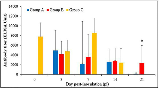 Fowl adenovirus (FAdV) antibody response in commercial broiler chickens following inoculation with live attenuated UPM1137CEL35 FAdV isolate in groups A (oral route), B (intraperitoneal route) and C (Control) from day 0 to 21pi. The antibody titre was significantly higher (p<0.05)* in group B than groups A and C at day 21 pi. Bar indicated as standard deviation.