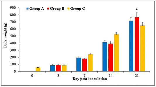 Body weight of chickens following inoculation with live attenuated Fowl adenovirus (FAdV) isolate (UPM1137CEL35) from days 0 to 21 days post-inoculation (pi) in groups A (oral route), B (intraperitoneal route) and C (control) throughout the trial. There are significantly lower (p<0.05) in body weight of chickens in groups A and B at days 7 and 14pi compared to group C. At day 21pi, the body weight of chickens in group B are significantly higher (p<0.05)* than group C. Bar indicated as standard deviation.