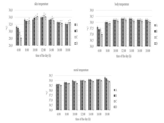 Conditions of skin, body, and rectal temperature of group A, B, C, and D goats. Within each observation time, bars with different letters (a,b) showed significant differences between groups (P<0.05).