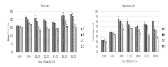 Conditions of heart and respiratory rate of Groups A,B,C, and D goats. Within each observation time, bars with different letters (a,b) showed significant differences between groups (P<0.05).