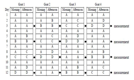 Schedule of feeding and time parameter measurement. Group A feeding was in the form of concentrate and silage as much as 1400 gr/day, group B was 1000 gr/day, group C was 700 gr/day, and group D was 500 gr/day.