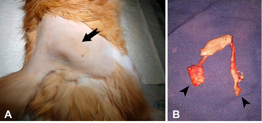 Trichogranuloma in a cat. A. Right pelvic limb showing a firm elastic nodular mass (arrow). B. Surgical excision of the nodular mass showing two tubelike structures (fistulous tract) with blind edges (arrow heads).
