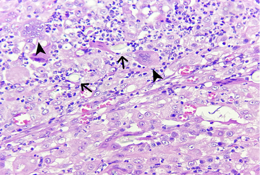 Trichogranuloma in a cat. Cutaneous nodule. There are fragments of free hair shaft (arrows) surrounded by giant foreign body cells (arrow heads) and leukocytic infiltration. (400 X, H&E).