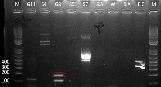 Gel analysis using Tat-domain encoding gene Burkholderia sp. primer. M - GeneRuler1kb plus DNA ladder. W – Double Distilled Water. S.A. – Staphyloccocus aureus. E.C. – Escherichia coli.