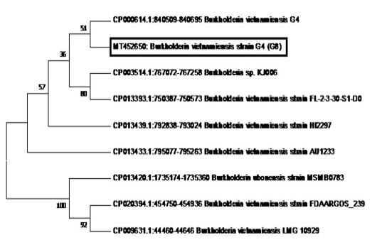 Phylogenetic tree showing the relationship of sample G8 (in the box with Accession Number MT452650) to B. vietnamiensis sequences registered in GenBank.