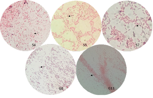 Gram-staining of bacterial isolates observed under oil immersion at 1000x.
