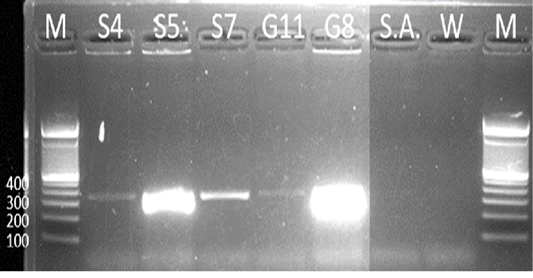 Gel analysis using Burkholderia-specific 16S rDNA. M - GeneRuler1kb plus DNA ladder. S.A – Staphylococcus aureus. W – Double Distilled Water