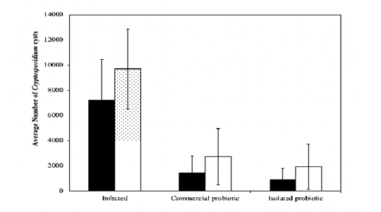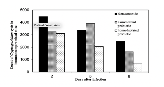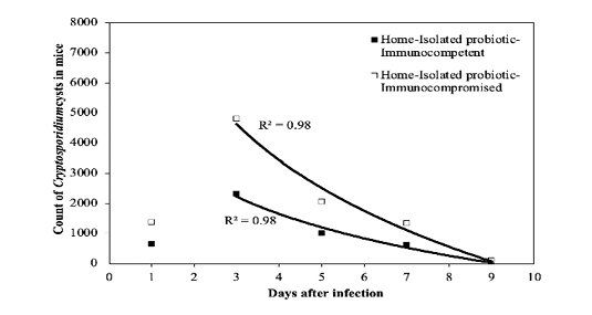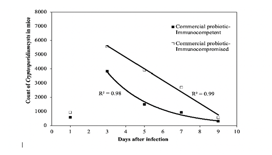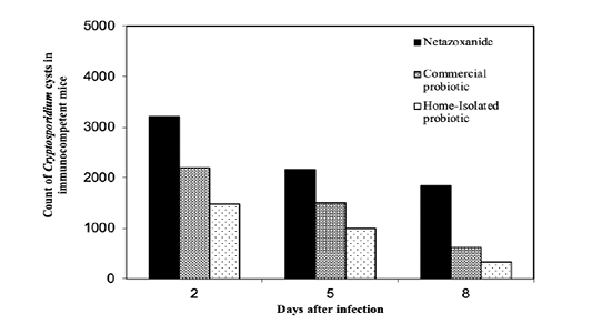 Treatment protocols for the immunocompromised mice compared to Nitazoxanide The counts of Cryptosporidium spp. cysts on the days 2 and 8 post infection were calculated for the mice treated with the two probiotics using the decay model.