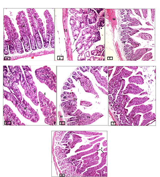 Cross-sections of intestinal tissues stained with hematoxylin and eosin. A) Control group, magnification 20x. B) Infected immunocompetent mice, magnification 40x. C) Immunocompetent mice infected and treated with the commercial probiotic, magnification 10x, D) Immunocompetent mice infected and treated with home-isolated probiotics, magnification 40x. E) Infected immunocompromised mice magnification 10x. F) Immunocompromised mice infected and treated with commercial probiotic magnification 20x. G) Immunocompromised mice infected and treated with home-isolated probiotic magnification 10x. Villi (V), Lamina Propria (LP), Goblet Cells (G), Degenerated Villi (DV), Fused Villi (FV), and Cell Infiltrate (I).