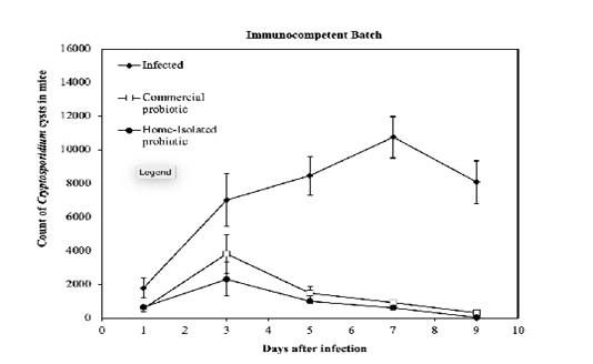 Count of Cryptosporidium cysts every other day post-infection of the groups of immunocompetent mice treated with a commercial- and home-isolated probiotics compared to the infected untreated controls. The thin vertical bars at each point refer to the standard errors of the tested samples.