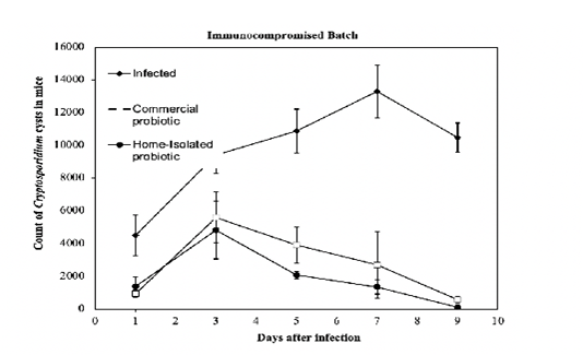Count of Cryptosporidium cysts every other day post-infection of the groups of immunocompromised mice treated with a commercial- and home-isolated probiotics compared to the infected untreated controls. The thin vertical bars at each point refer to the standard errors of the tested samples.