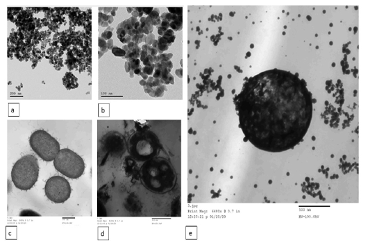 Transmission electron microscopy (TEM) of ZnO NPs. (a and b) the shape of the synthesized ZnO NPs under TEM. TEM image of S. parauberis cultured in the absence (c) and presence (d) of chemically synthesized ZnO NPs. e) ZnO NPs attached to the bacterial cell membrane and appeared intracellularly. The scale bars are indicated.