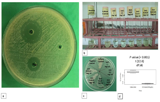 Antimicrobial activity of ZnO NPs. a) Antimicrobial activity of ZnO NPs on MHA. b) MIC of ZnO NPs against S. parauberis on MHB. c) MBC of ZnO NPs against S. parauberis on antibiotic free TSA. d) Cell viability after treatment with ZnO NPs using TTC assay. Positive and negative controls are indicated.