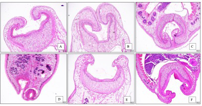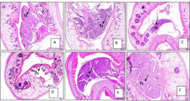 Reproductive organs of Paramphistomum cervi after treatment. A. 5% extract B. 10% extract. C. 25% extract. D. 40% extract. E. Negative control. F. Positive control. Ts: testes.