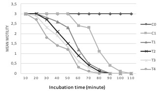 Mean motility dan mortality time of Paramphistomum cervi. C0= negative control (PBS); C1= positive control (albendazole); T1= 5% of Nigella sativa extract; T2= 10% of Nigella sativa extract; T3= 25% of Nigella sativa extract; T4= 40% of Nigella sativa extract.