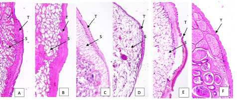 Tegument of Paramphistomum cervi after treatment. A: 5% extract; B: 10% extract; C: 25% extract; D: 40% extract of Nigella sativa. E. Positive control (albendazole) F. Negative control (PBS). T: tegument; S: swelling of tegument