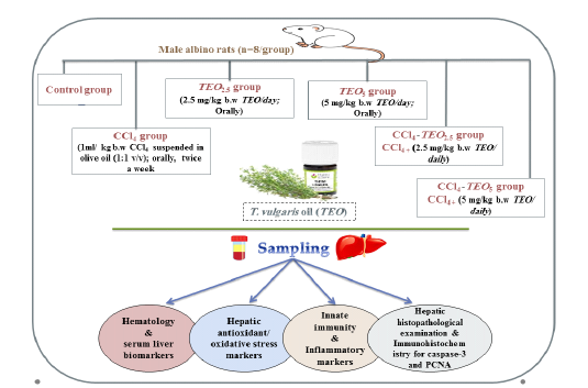 The experiment design and treatment doses used for TEO. CCl4; carbon tetrachloride, TEO; thymus vulgaris oil.
