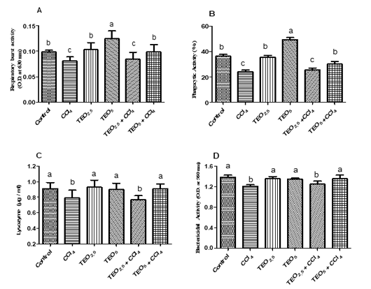 Respiratory burst (A) phagocytic (B) serum lysozyme (C) and bactericidal activities (D) of albino male rats treated with thymus vulgaris oil (TEO2.5 (2.5 mg/ kg b.w) and TEO5 (5 mg/ kg b.w)) and CCl4 for 4 weeks. Data are expressed as Mean ± SEM. The different letters indicate significant difference (P < 0.05) between treated groups.