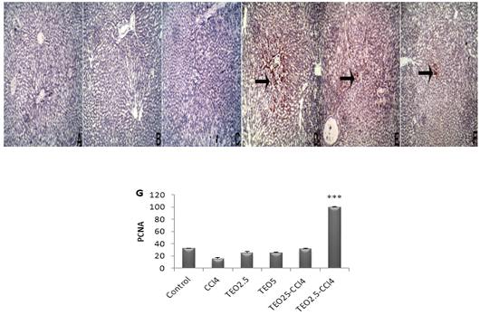 The immunohistochemical expression and quantitation of PCNA in the liver. (A) Control, (B) TEO2.5, (C) TEO5, ( D) CCl4, (E) TEO2.5-CCl4, (F) TEO5-CCl4 groups and (G) scoring for 4 weeks. Data are expressed as Mean ± SEM. Data are presented as mean ± standard error (***p value < 0.001).