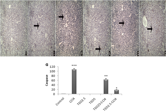 The immunohistochemical expression and quantitation of caspase 3 in the liver. (A) Control, (B) TEO2.5, (C) TEO5, (D) CCl4, (E) TEO2.5-CCl4, (F) TEO5-CCl4 groups and (G) scoring for 4 weeks. Data are expressed as Mean ± SEM. Data are presented as mean ± standard error (***p value < 0.001).