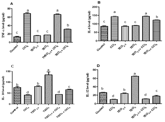 Serum cytokines levels; TNF-α (A), IL-6 (B), IL-10 (C) and IL-12 (D) of albino male rats treated with thymus vulgaris oil (TEO2.5 (2.5 mg/ kg b.w) and TEO5 (5 mg/ kg b.w)) and CCl4 for 4 weeks. Data are expressed as Mean ± SEM. The different letters indicate significant difference (P < 0.05) between treated groups.