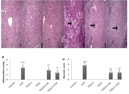 Hematoxylin and eosin staining of liver sections from rats. (A) Control, (B) TEO2.5, (C) TEO5, ( D) CCl4, (E) TEO2.5-CCl4 , (F) TEO5-CCl4 groups, (G) inflammation and (H) necrosis scoring for 4 weeks. Data are presented as mean ± standard error (***p value < 0.001).