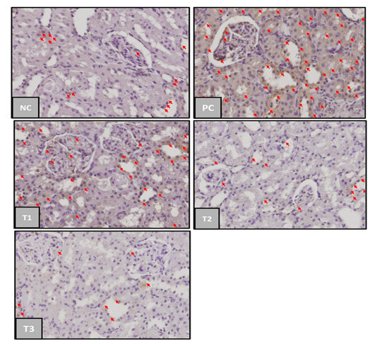 TNF-α-expression in kidney of acute kidney injury (AKI). Negative control group (NC); Positive Control Group (PC); blueberries extract on therapy group with dosage of 500 mg/kg (T1); dosage 1000 mg/kg (T2); dosage 1500 mg/kg (T3); the red arrow indicated TNF–α expression. (immunochemistry staining, magnification 400x).