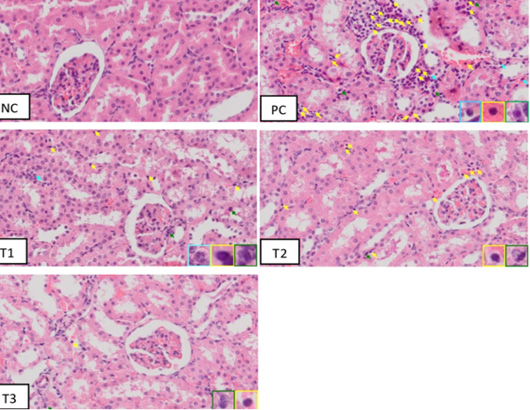 Inflammatory cells on histopathology of Acute Kidney Injury, Negative Control Group (NC) Positive Control Group (PC); Blueberries extract therapy group dosage 500 mg/kg (T1); dosage 1000 mg/kg (T2); dosage 1500 mg/kg (T3). Note: light blue arrow indicated neutrophils inflammatory cells, green arrow indicated macrophage inflammatory cells, and yellow arrow indicated lymphocyte inflammatory cells. (HE staining; magnification 400x)