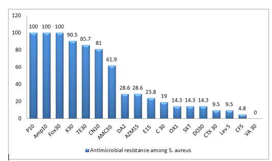 Antimicrobial resistance to 18 antimicrobials of S. aureus isolates from duck farms. The columns denote the percentages of resistant isolates for ducks). Penicillin-G (P 10); ampicillin (AMP 10);cefoxitin (FOX 30); Kanamycin (K 30); Tetracycline (T 30); gentamicin (CN 10); Amoxicillin + clavulanic acid (AMC 30); Clindamycin (DA2); Azithromycin (AZM 15); Erythromycin (E 15 ); Chloramphenicol (C 30 ); Oxacillin (OX1); Trimethoprim/sulfamethoxazole (SXT), Doxycycline (DO 30); cefotaxime (CTX 30); Levofloxacin (Lev 5); Ciprofloxacin (CF5 ); vancomycin (VA 30 )