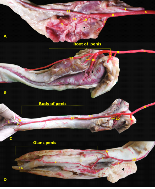 A- Origin of penial artery. B- branches of penial artery at penial root, C- branches of dorsal penial artery in penial body, D- dorsal penial artery at glans penis.