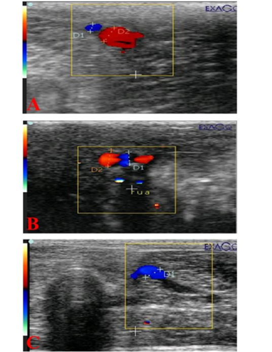 Ultrasonograms showing internal pudendal artery (I Pu.A.) (A), dorsal penile artery (Do Pe.A) (B), and deep penile artery (De Pe.A) (C), diameters (mm) in dogs suffered from TVT.
