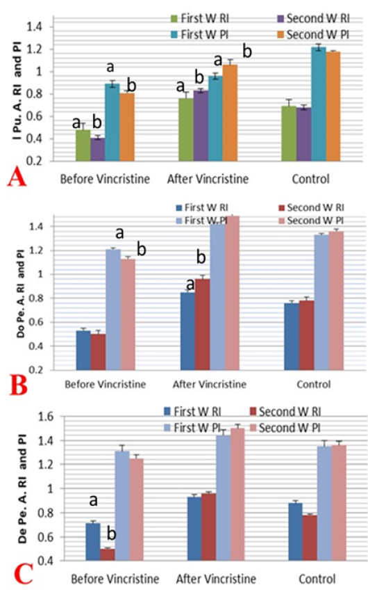Mean ± SD internal pudendal artery (I Pu.A.) (A), dorsal penile artery (Do Pe.A) (B), and deep penile artery (De Pe.A) (C) resistance index (RI) and pulsatility index (PI) during the first and second week before and after treatment by vincristine compared to control group.